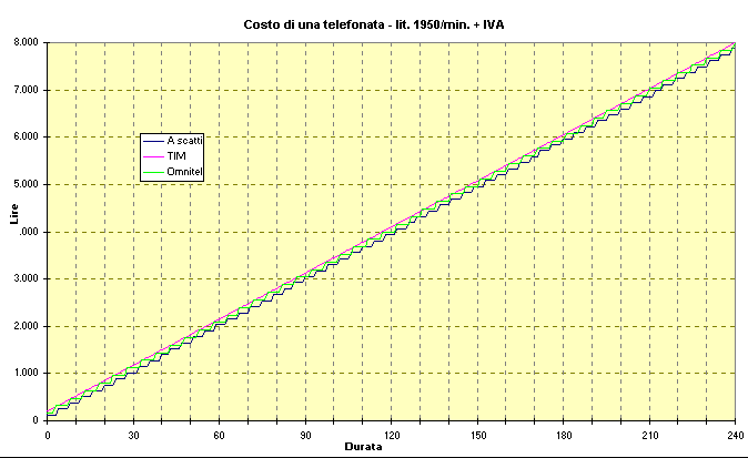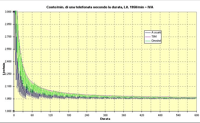 Come si vede, a causa della vicinanza degli scatti i tre costi non sono molto distanti tra loro. Succede anche un fenomeno curioso: poiché i primi 3 secondi sono paragonabili alla durata di uno scatto normale, la tariffa TIM risulta lievemente meno conveniente (in media) di quella Omnitel. Ma è una magra consolazione: è molto raro che per telefonare si impieghi questa fascia oraria, ed il risparmio (cui si aggiunge il fatto che la tariffa TIM corrispondente è di 1940 lire/min. e non 1950) quasi inesistente. Vediamo anche il costo al minuto: